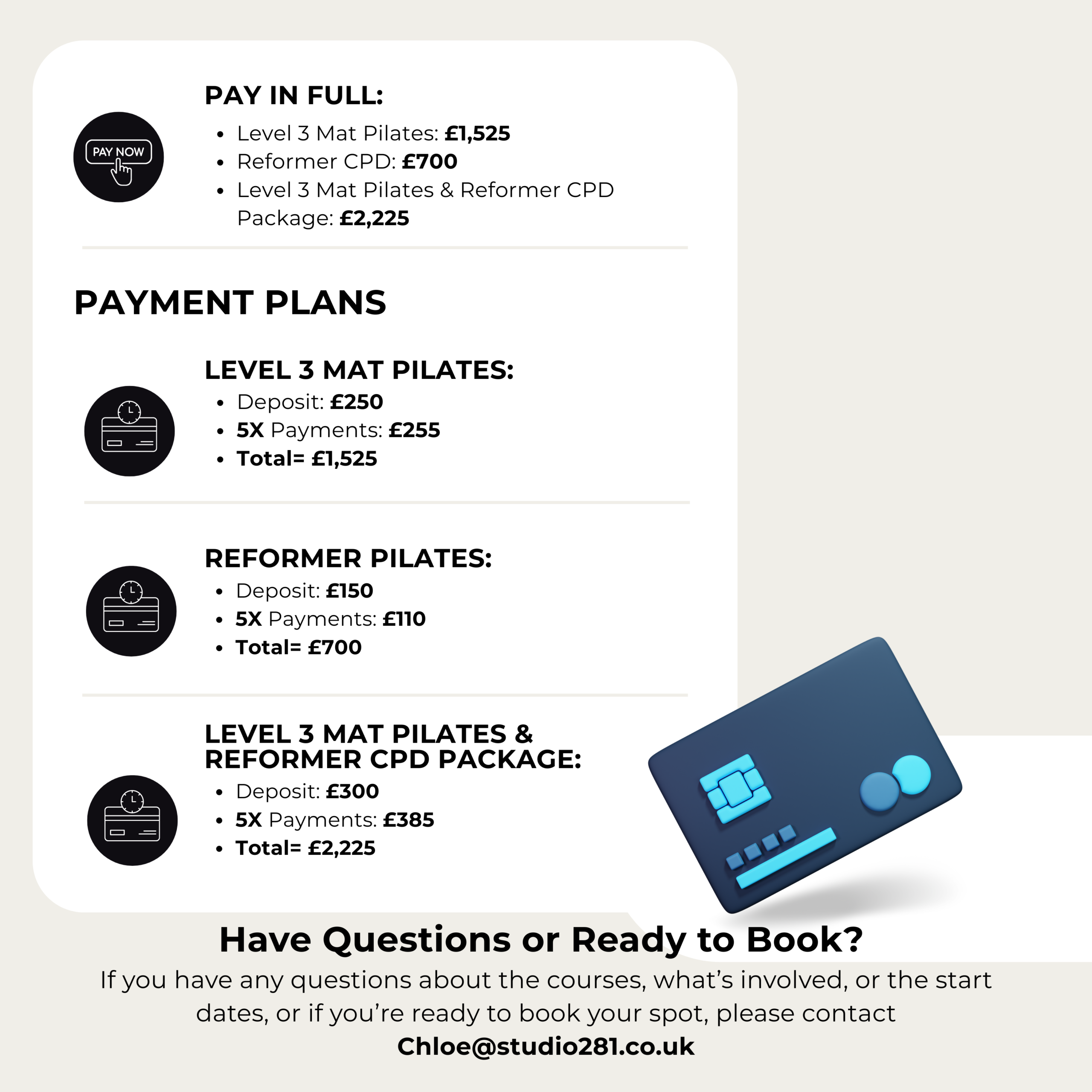We offer flexible payment options for your convenience, allowing you to spread the cost of your training over several months. Below are the available payment plans for the Level 3 Mat Pilates and Reformer CPD courses: